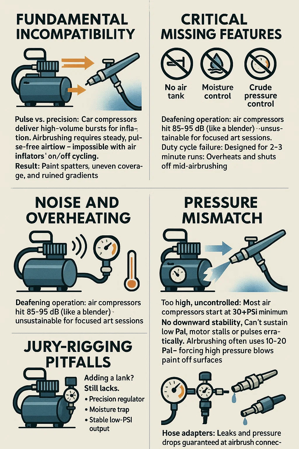 Príliš vysoká, nekontrolovaná: Väčšina vzduchových kompresorov začína pri minimálnej hodnote 30 PSI. Airbrushing často používa 10-20 PSI – vynútenie vysokého tlaku vyfúkne farbu z povrchov.
