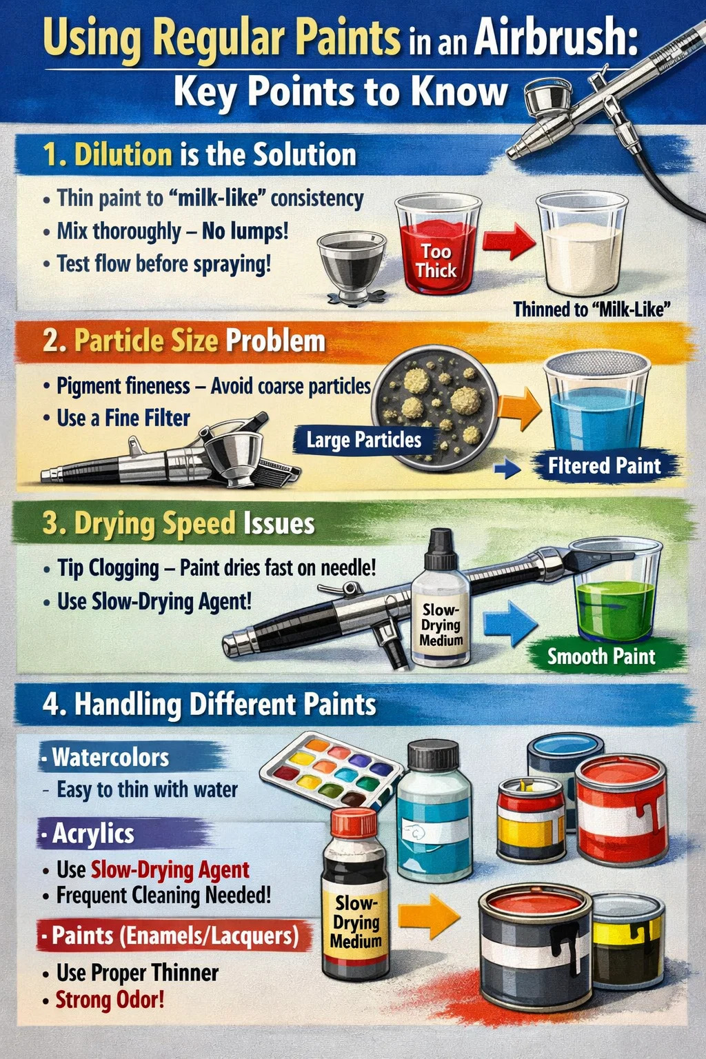 Tryska airbrushu je mimoriadne jemná, dokonca tenšia ako hrot ihly. Ak priamo do nej dáte bežné farby používané na maľovanie stien, vodové farby alebo akrylové farby, výsledkom je len jeden: okamžite sa upchá.
