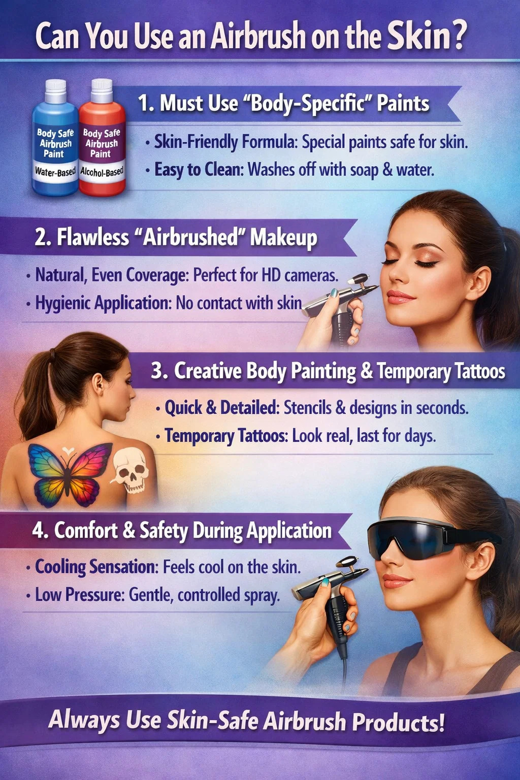 Pomocou an airbrush na koži nielenže dosahuje úroveň detailov neporovnateľnú s aplikáciou rukou, ale vytvára aj neuveriteľne realistické vizuálne efekty. Keďže je však pokožka súčasťou ľudského tela, je potrebné vziať do úvahy niekoľko veľmi dôležitých faktorov: