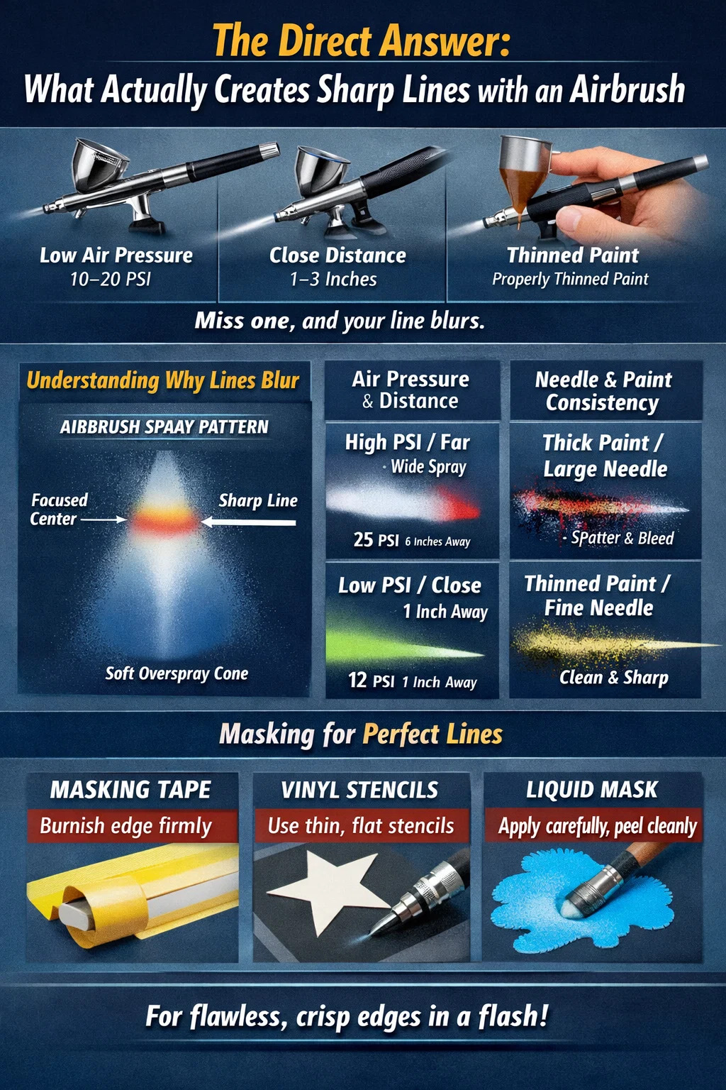 Vysoký PSI nielenže rozširuje sprej, ale tiež zvyšuje prestriekanie a spätný ráz, ktorý rozptýli častice farby mimo zamýšľanú čiaru. Pre jemné línie väčšina skúsených používateľov airbrush pracuje medzi 10 a 18 PSI. Niektorí maliari miniatúr klesnú ešte nižšie, na 6–8 PSI, keď robia prácu s detailmi vlasovej línie. Kompromisom pri veľmi nízkom PSI je, že tok farby sa stáva nekonzistentným, ak farba nie je dostatočne riedená, takže obe premenné musia byť spolu vyvážené.