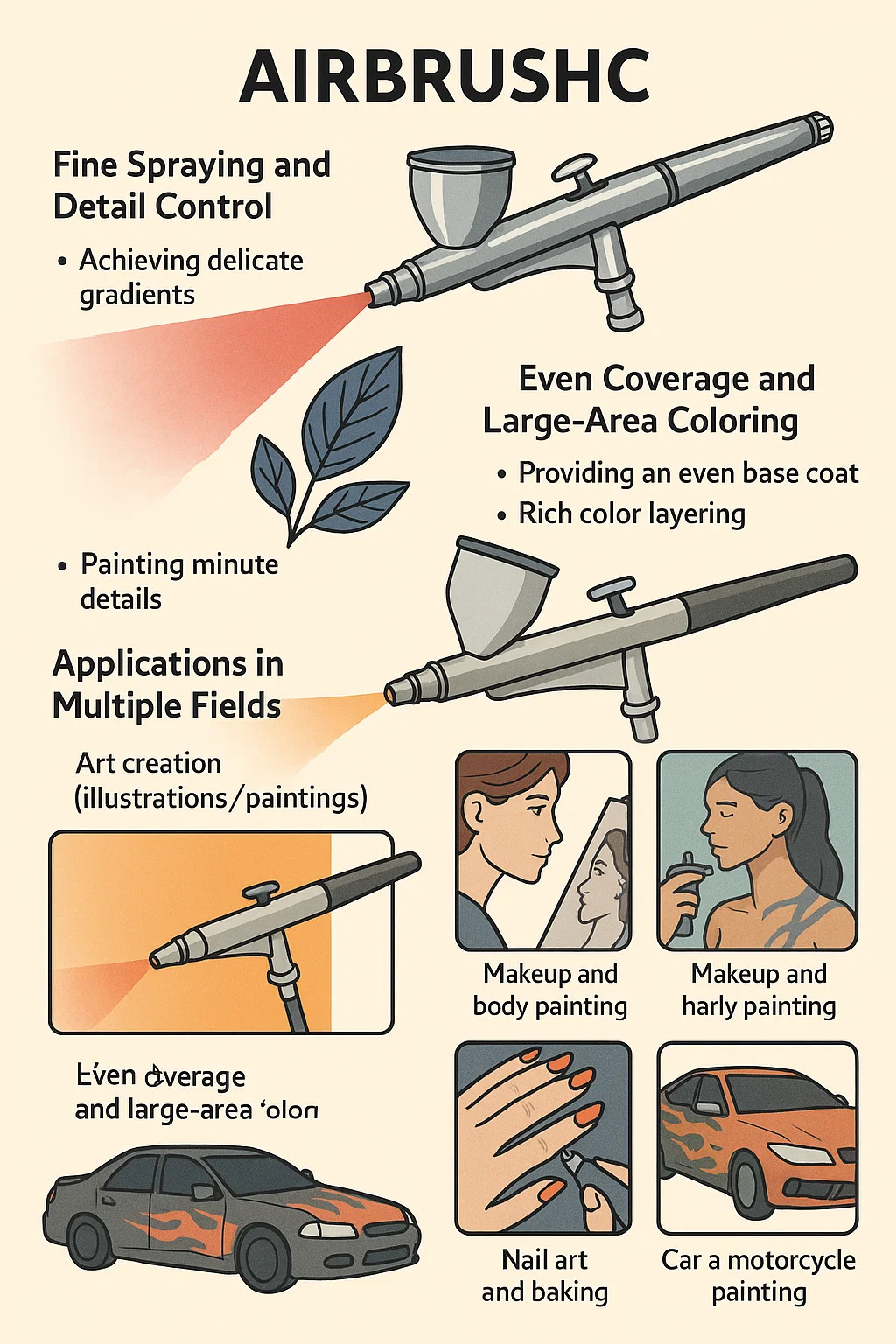 - Make-up a maľovanie na telo: V javiskovom, filmovom alebo svadobnom make-upe poskytuje airbrush make-up ľahký, dlhotrvajúci a rovnomerný základ. Používa sa na maľovanie na telo alebo látku na vystúpenia alebo módnu dekoráciu.