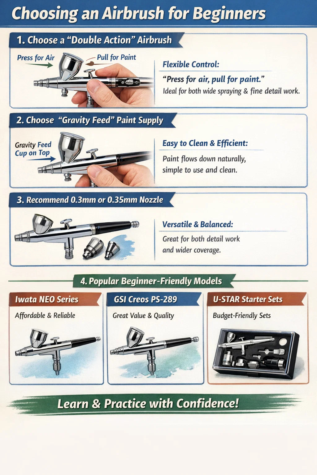 Tu je niekoľko praktických tipov na výber airbrush pre začiatočníkov: