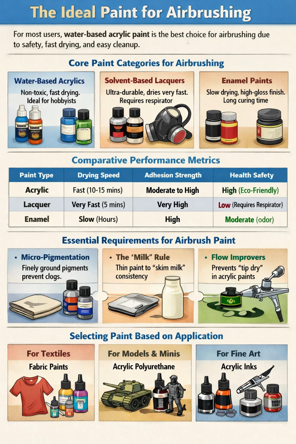 Pre veľkú väčšinu používateľov akrylová farba na vodnej báze je najlepšou voľbou pre airbrush. Ponúka optimálnu rovnováhu netoxická bezpečnosť, rýchle schnutie a jednoduché čistenie jednoduchou vodou alebo špeciálnymi čistiacimi prostriedkami. Zatiaľ čo pokročilí fanúšikovia môžu používať laky pre extrémnu odolnosť, akryláty sú priemyselným štandardom pre všeobecnú ilustráciu, modelovanie v mierke a textilné práce vďaka ich všestrannosti na rôznych povrchoch a minimálnemu chemickému zápachu.